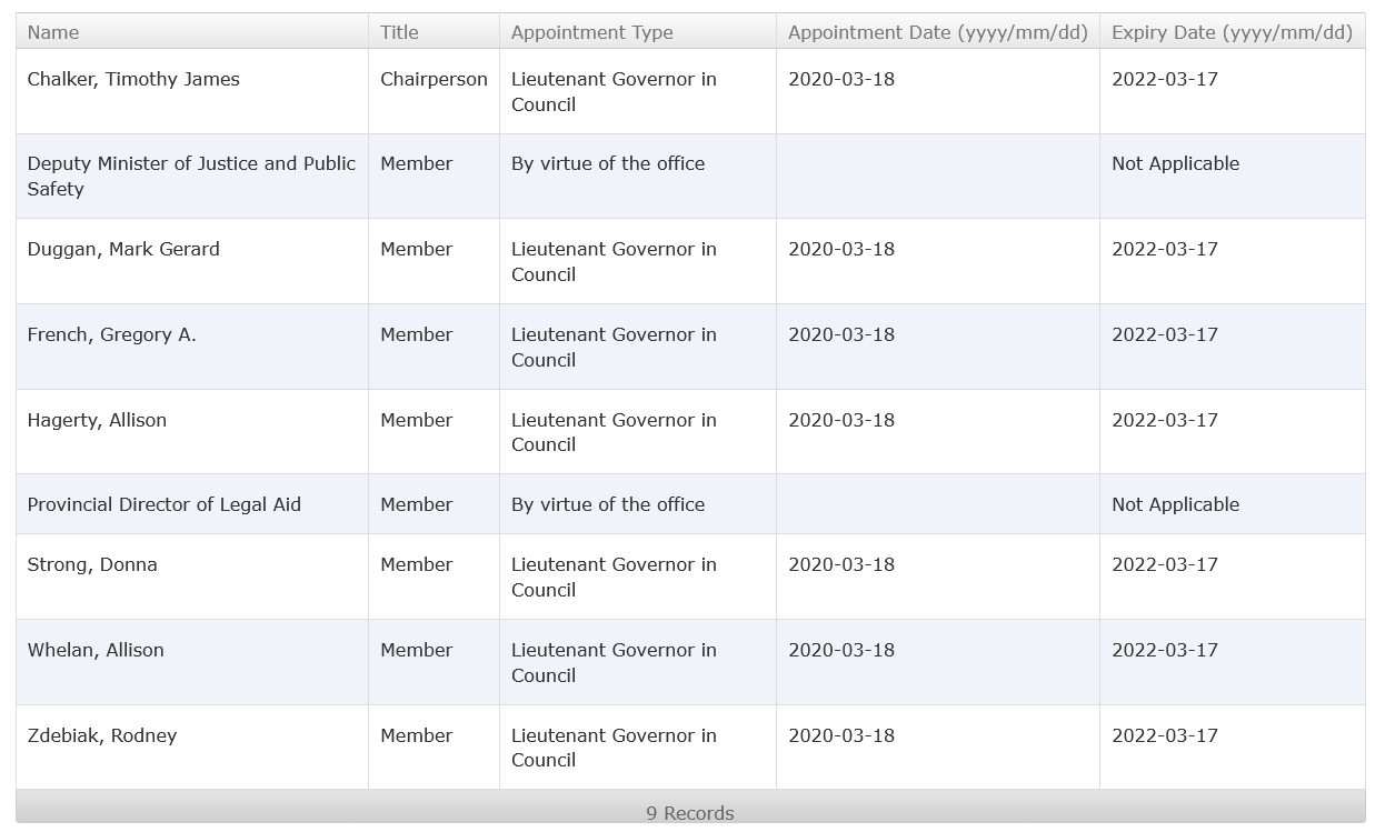 Conformément à l'article 3(3) de la Loi sur l'Aide juridique (Legal Aid Act), trois des commissaires doivent être des avocats choisis sur une liste de cinq personnes soumise au ministre par la Law Society of Newfoundland and Labrador. Les quatre (4) autres membres sont des personnes issues du grand public.