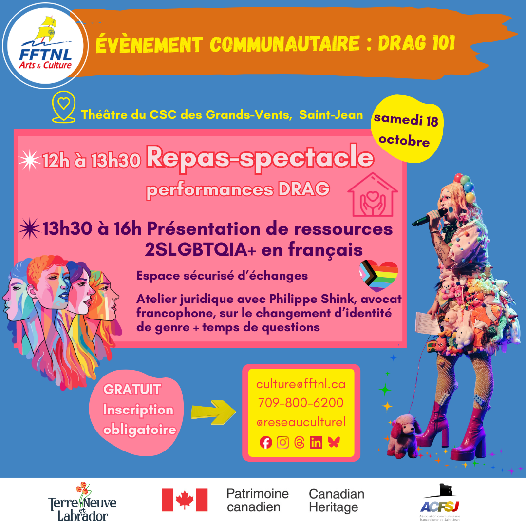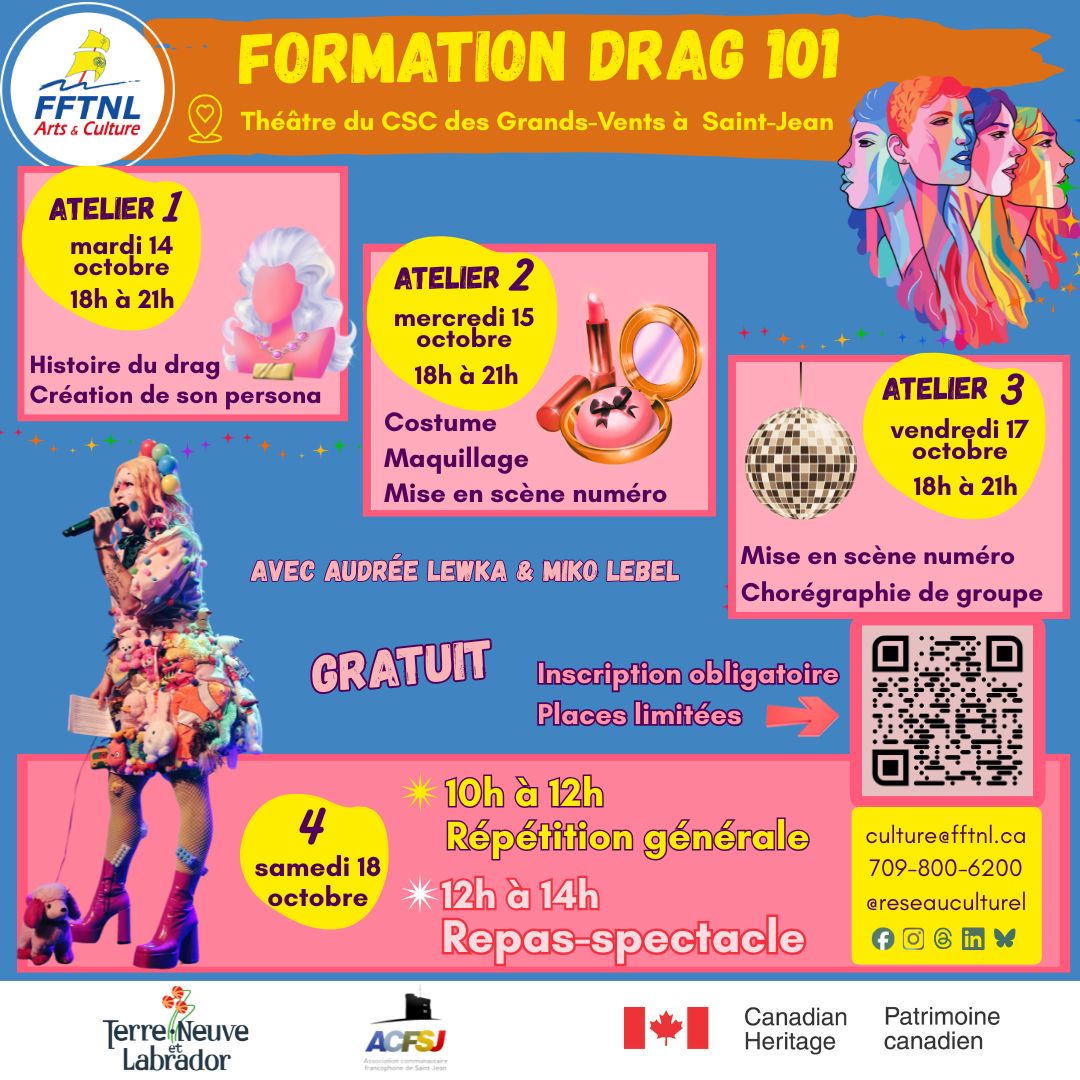 Ateliers DRAG 101 au CSC des Grands-Vents, du 14 au 17 octobre, pour découvrir l'histoire du drag, créer un personnage et explorer la performance artistique.