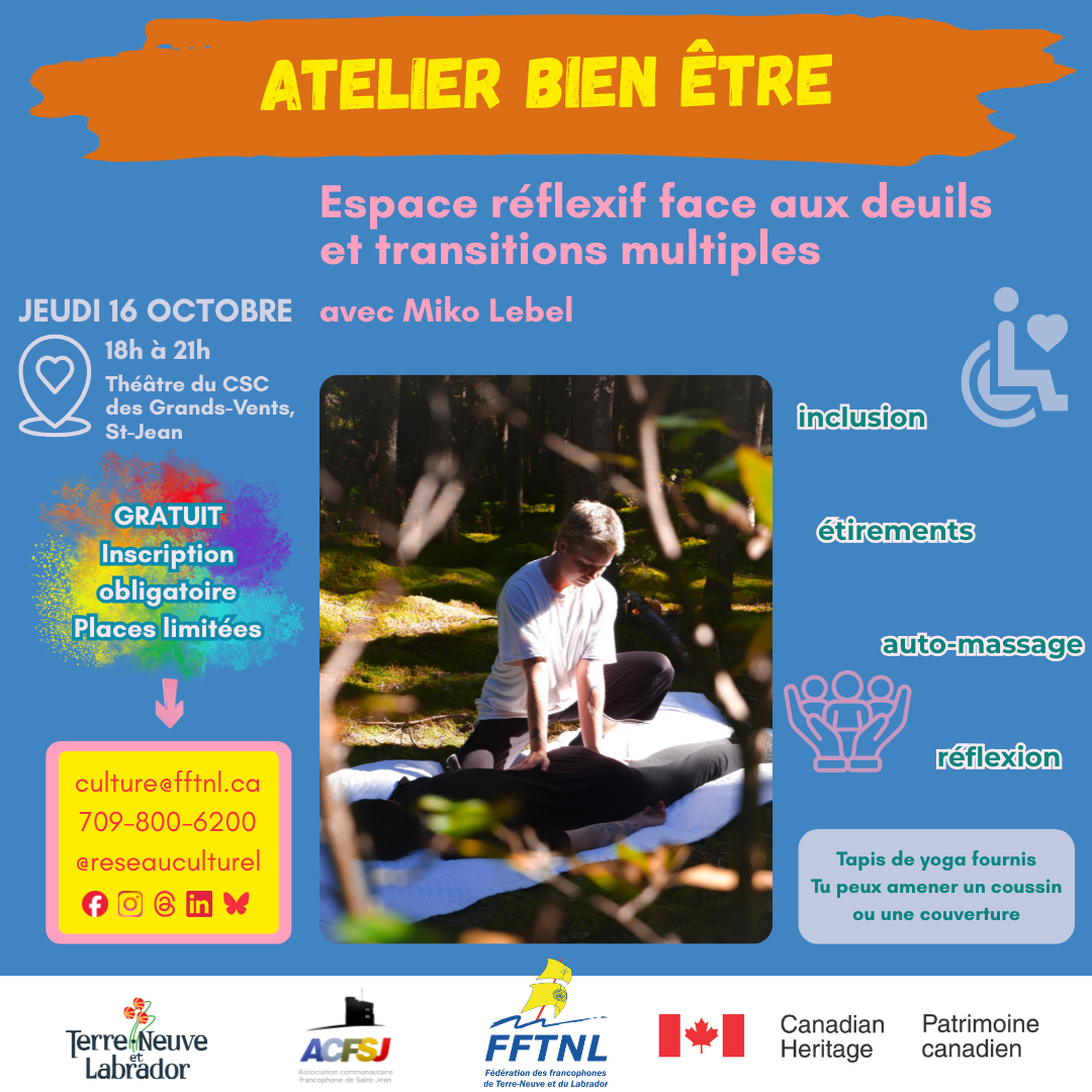 Atelier bien-être le jeudi 16 octobre, un moment d'exploration corporelle autour du deuil, des transitions et du mouvement somatique.