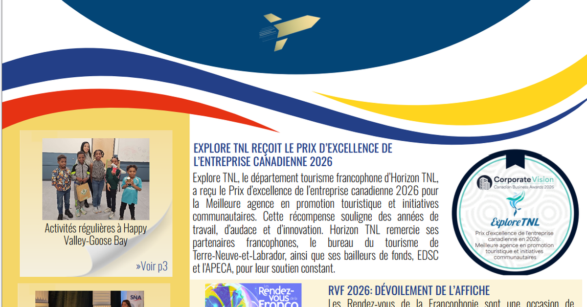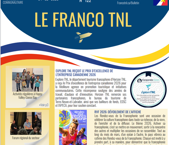 Découvrez l'actualité francophone de Terre-Neuve-et-Labrador: retour sur les activités passées, portrait d'artistes franco-terre-neuviens, les services en français à TNL, agenda des activités à venir, etc...